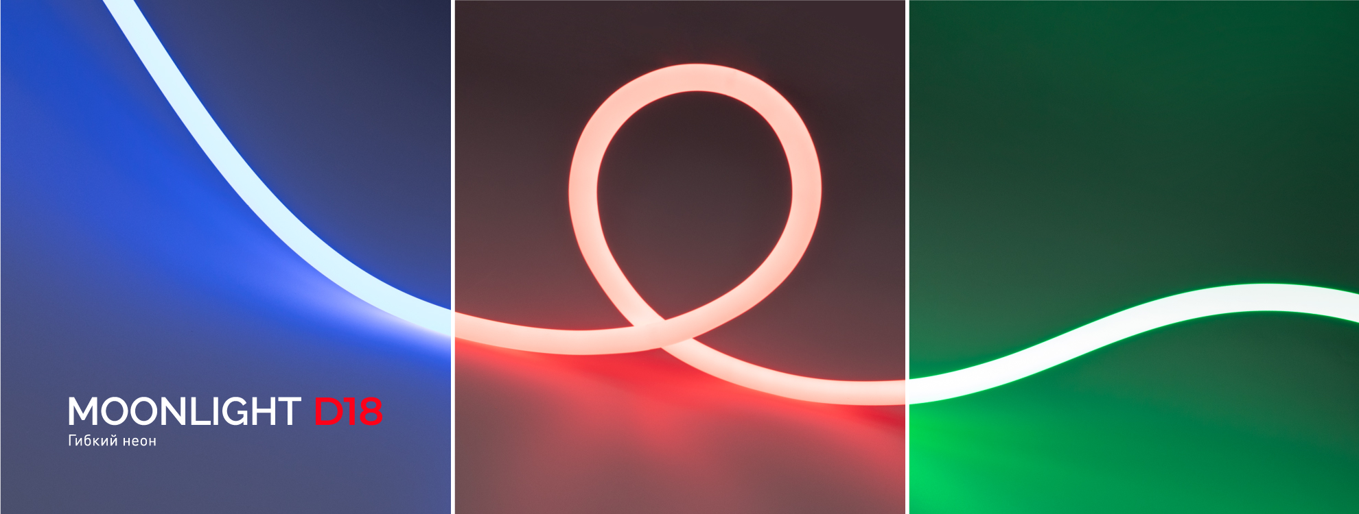 Гибкий неон MOONLIGHT с диаметром 18 мм обладает равномерным свечением, направленным на 360°. С помощью MOONLIGHT D18 возможно создать локальное и декоративное освещение, а также оригинальные арт-объекты. 3D-инсталляции на основе круглого гибкого неона гармонично впишутся в гостиные, кухни, детские, а также в коммерческие пространства.