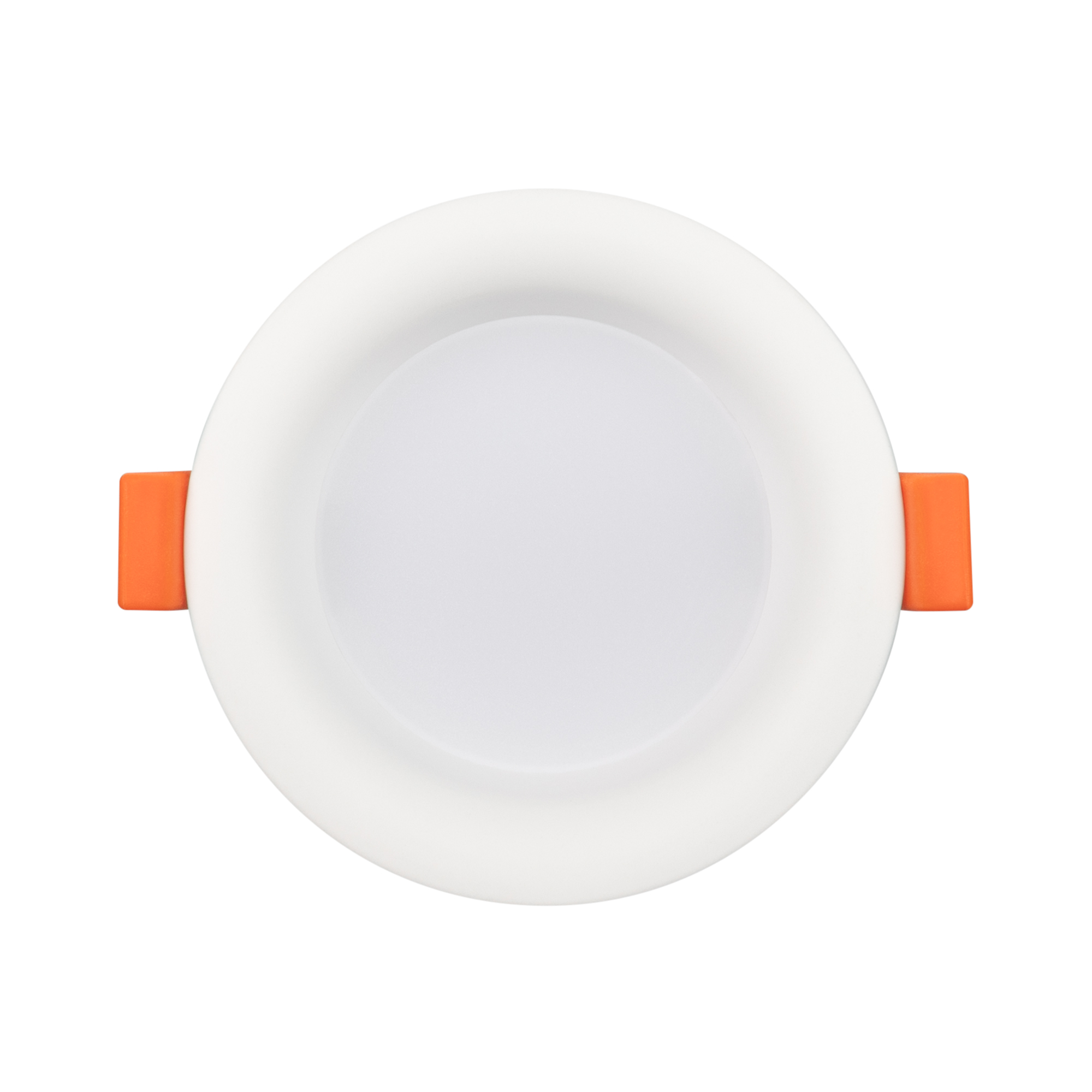 Встраиваемый светильник даунлайт с интегрированным в корпус драйвером. Мощность 6 Вт, св. поток 520 лм, 87 лм/Вт, дневной 4000 K, CRI>90, угол 100°, напряжение питания 230 В. Белый круглый корпус из алюминия, степень защиты IP20. Размер: диаметр 90 мм, высота 61 мм. Монтаж встраиваемый, установочное отверстие: диаметр 75 мм. Пульсация <2%.