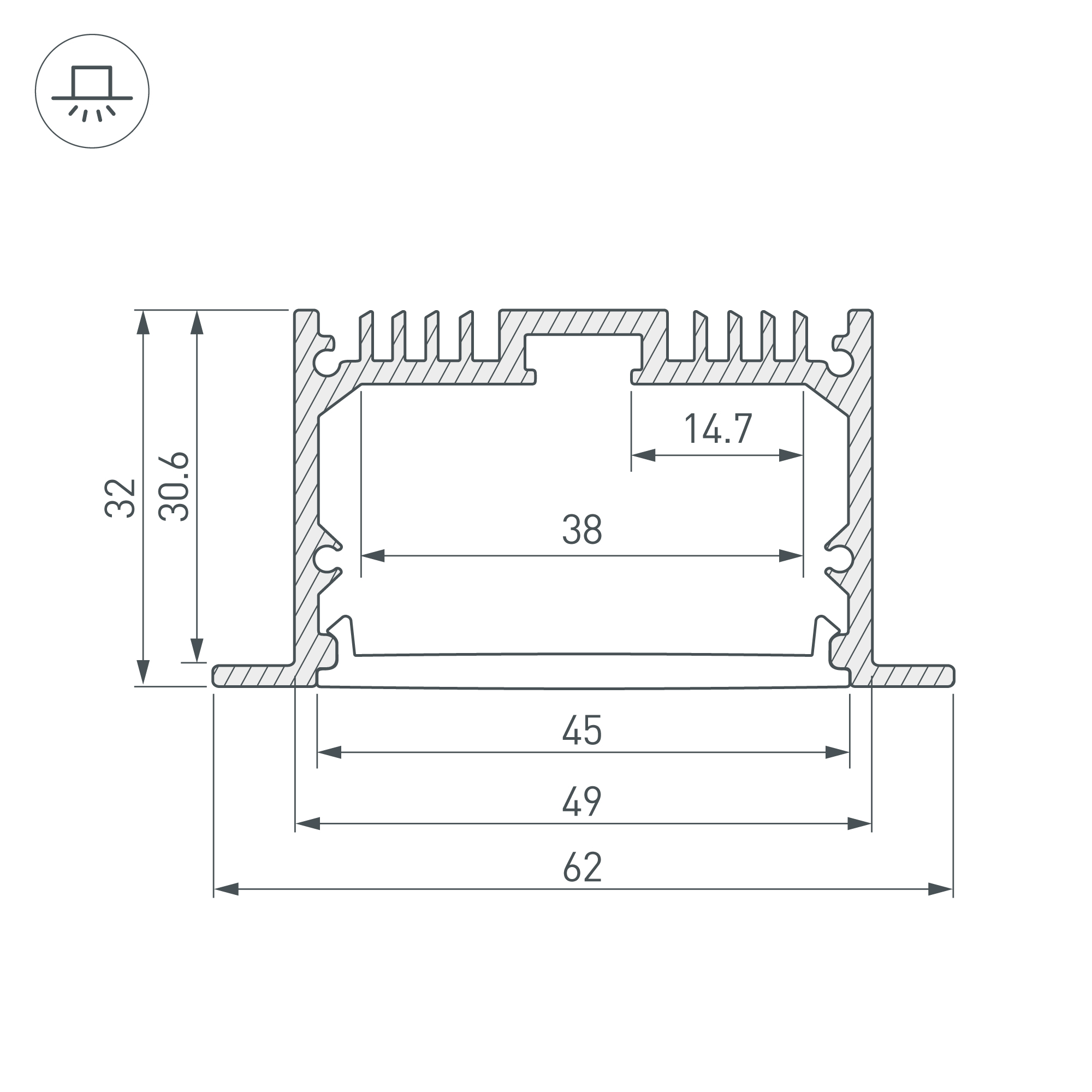 Встраиваемый профиль с накладным фланцем из анодированного алюминия для основной и контурной подсветки помещений. Габаритные размеры профиля составляют 3000 мм в длину, 62 мм в ширину и 32 мм в высоту, паз для установки 49 мм. Площадка для установки светодиодных лент позволяет использовать ленту шириной до 38 мм и мощностью до 46,4 Вт/м. Это обеспечивает гибкость в выборе светодиодных лент и создает потрясающие световые решения.