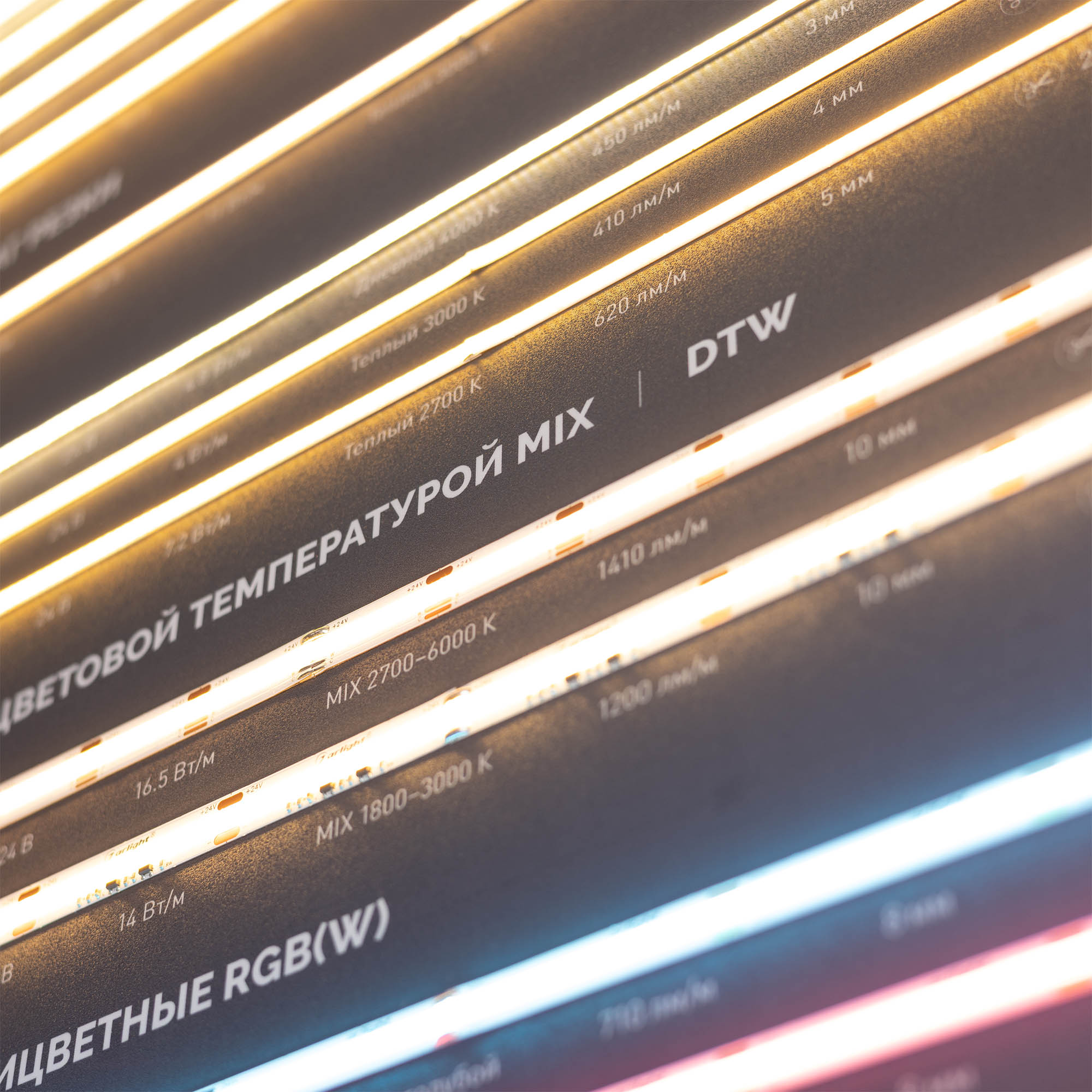 На стенде представлены ленты для создания основного и декоративного освещения: с высокой плотностью светодиодов, СОВ (без видимых светодиодов), ленты бокового свечения.