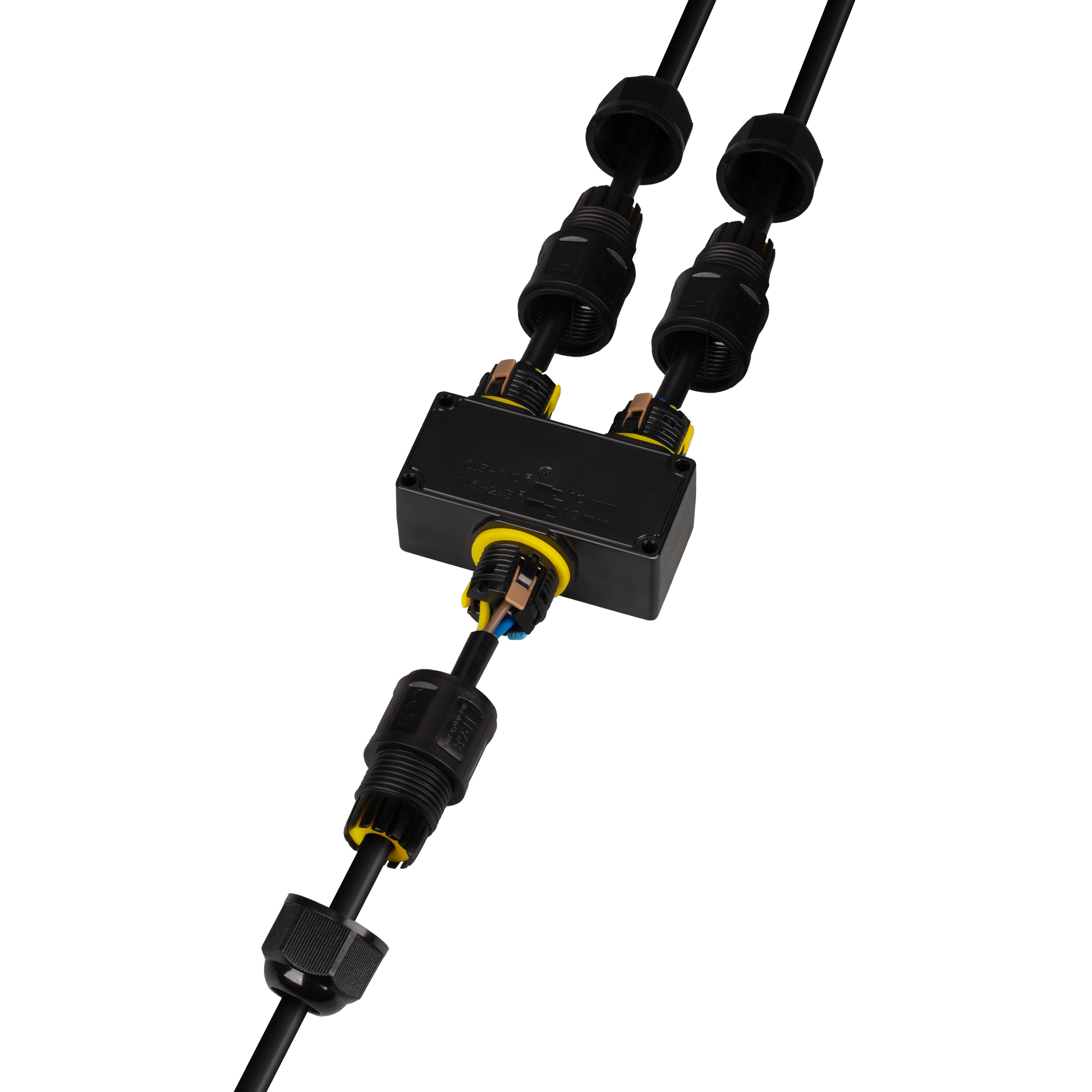 Коннектор пластиковый Y-образный трехконтактный для соединения проводов диаметром 4-8 мм, сечением 0,5-2,5 мм2. Номинальный ток 24 А. Номинальное напряжение 450 В. Цвет черный. Степень защиты IP68. Рабочая температура -40/ +100°С. Подключение питания без пайки.
