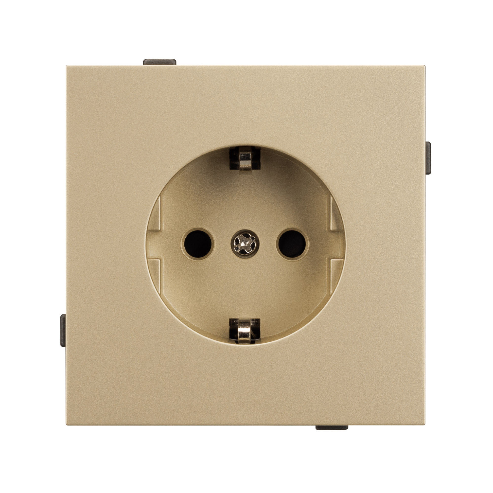Механизм розетки с заземление совместим с рамками серии TENDO, создает утонченный минималистичный вид. Скрытый тип монтажа позволяет гармонично встроить в интерьер любого современного дизайн-проекта. Видимая часть механизма выполнена из высококачественного пластика золотого цвета и имеет покрытие Soft-Touch. Розетка оснащена защитными шторками, которые защищают механизм устройства от повреждений и загрязнений, а также обеспечивают безопасное использование для каждого пользователя. Металлический суппорт окрашен порошковой краской в несколько слоев и выполнен из металла толщиной 1,5мм, что обеспечивает безопасность и уверенность в установке. А усиленные распорные (монтажные) лапки надежно фиксируют механизм в стандартном установочном подрозетнике. На каждой стороне суппорта размещены фиксирующие элементы, позволяющие комбинировать механизмы в системы до 5шт как горизонтально, так и вертикально, под соответствующую рамку.
