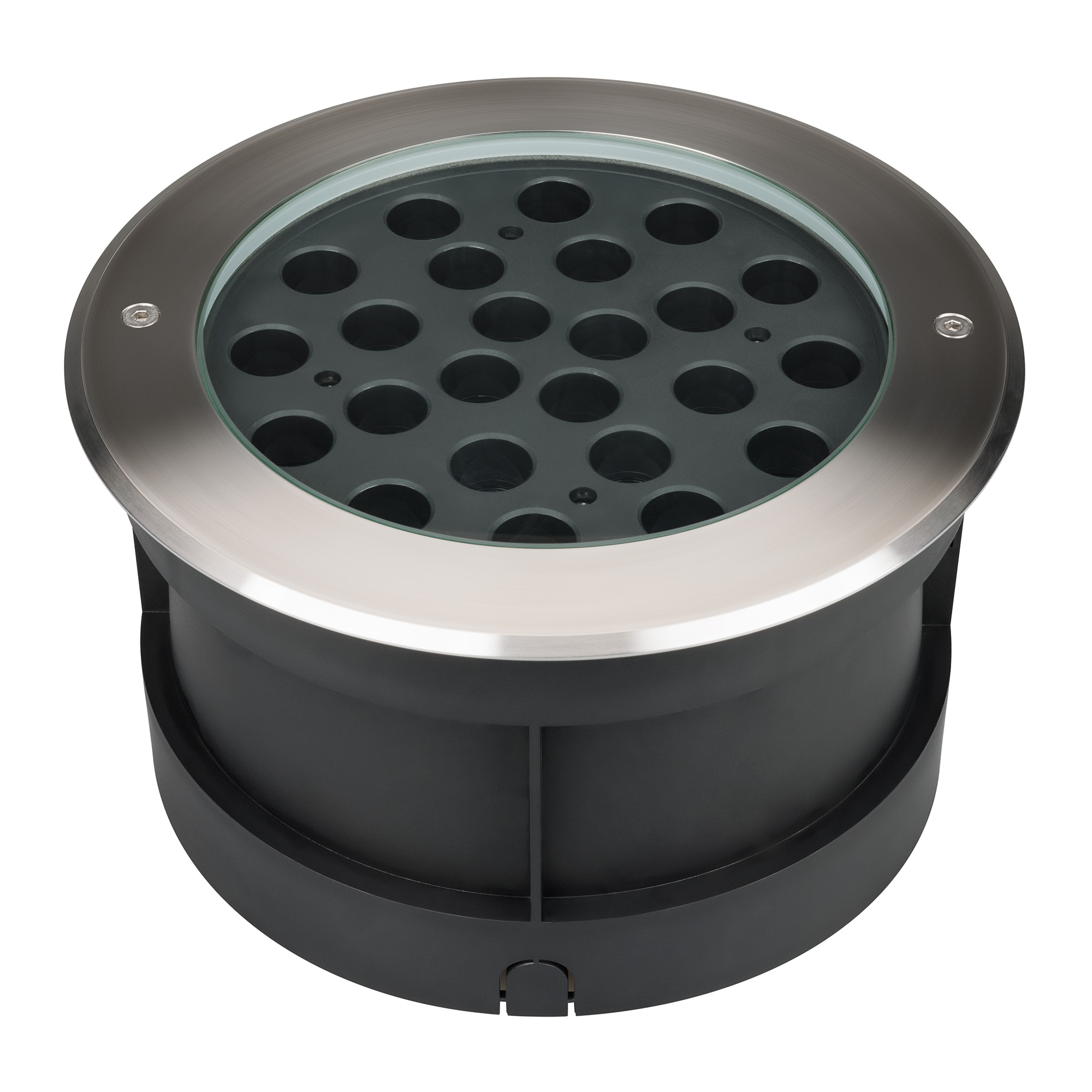 Встраиваемый светодиодный светильник для грунта и пола. Мощность 48Вт, световой поток 3250 лм, цвет теплый 3000К. CRI(Ra)>80, угол 10°. Круглый влагозащищенный корпус IP67, нержавеющая сталь. Экран закалённое стекло. Питание 230В, 48Вт. Размер DxH Ø260x150мм. Установка в отверстие DxH Ø239x144мм.
