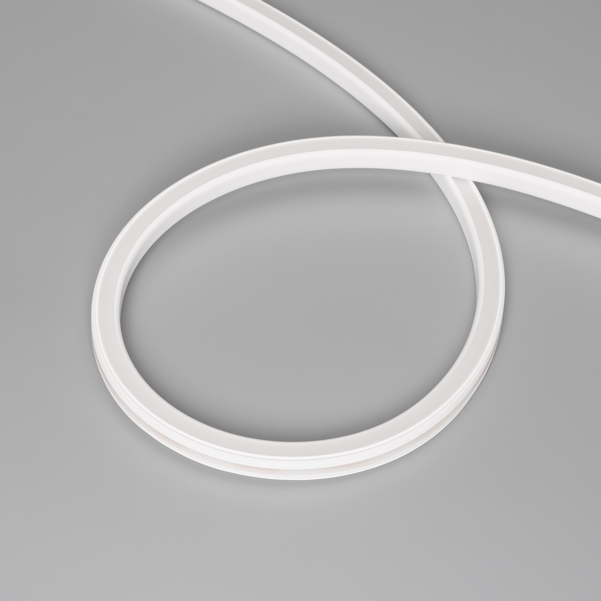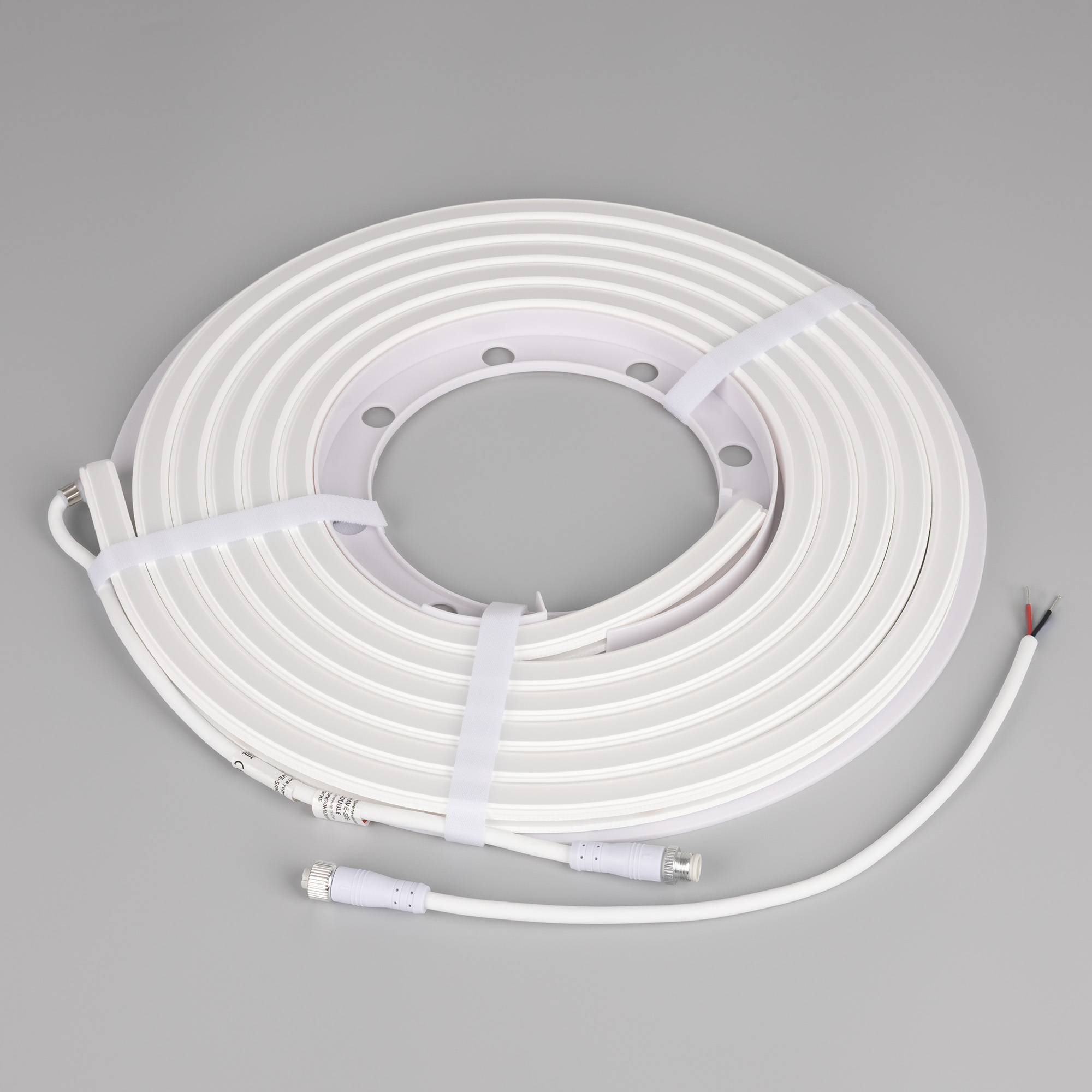 Гибкая герметичная лента (неон серии WAVE), сечение 16×15 мм. Светодиоды SMD2835 120 шт/м. Цвет свечения ХОЛОДНЫЙ БЕЛЫЙ (6000 К), индекс цветопередачи CRI>90, световой поток 636 лм/м, угол излучения 292°. Мощность 15 Вт/м, питание 24 В. Класс пылевлагозащиты IP67. Размеры 5000×16×15 мм. Мин. отрезок 50 мм. Горизонтальный изгиб SIDE, свечение в две стороны, минимальный радиус изгиба 100 мм. Вывод кабеля с одной стороны перпендикулярно линии сечения неона. Катушка 5 м. Цена за 1 м. Гарантия 5 лет.