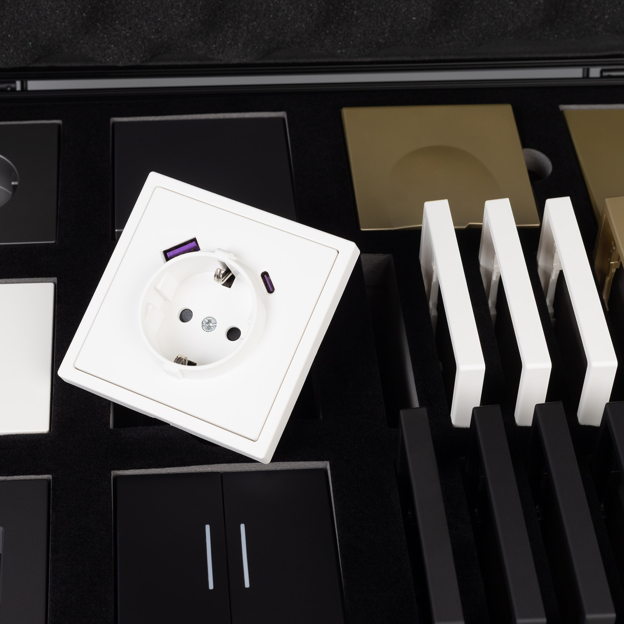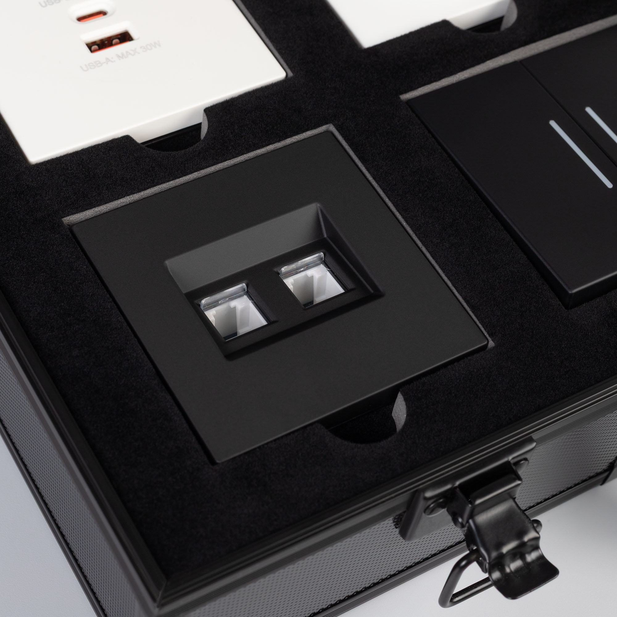 Демо-кейс с наполнением для демонстрации продукции ЭУИ серии NOBE. Материал: Алюминий + вспененный полиуретан. Ячейки для размещения: 8 мест под механизмы и 16 мест под однопостовые рамки. Габаритные размеры кейса: 280*400*100мм. Размер под логотип: 260*380мм