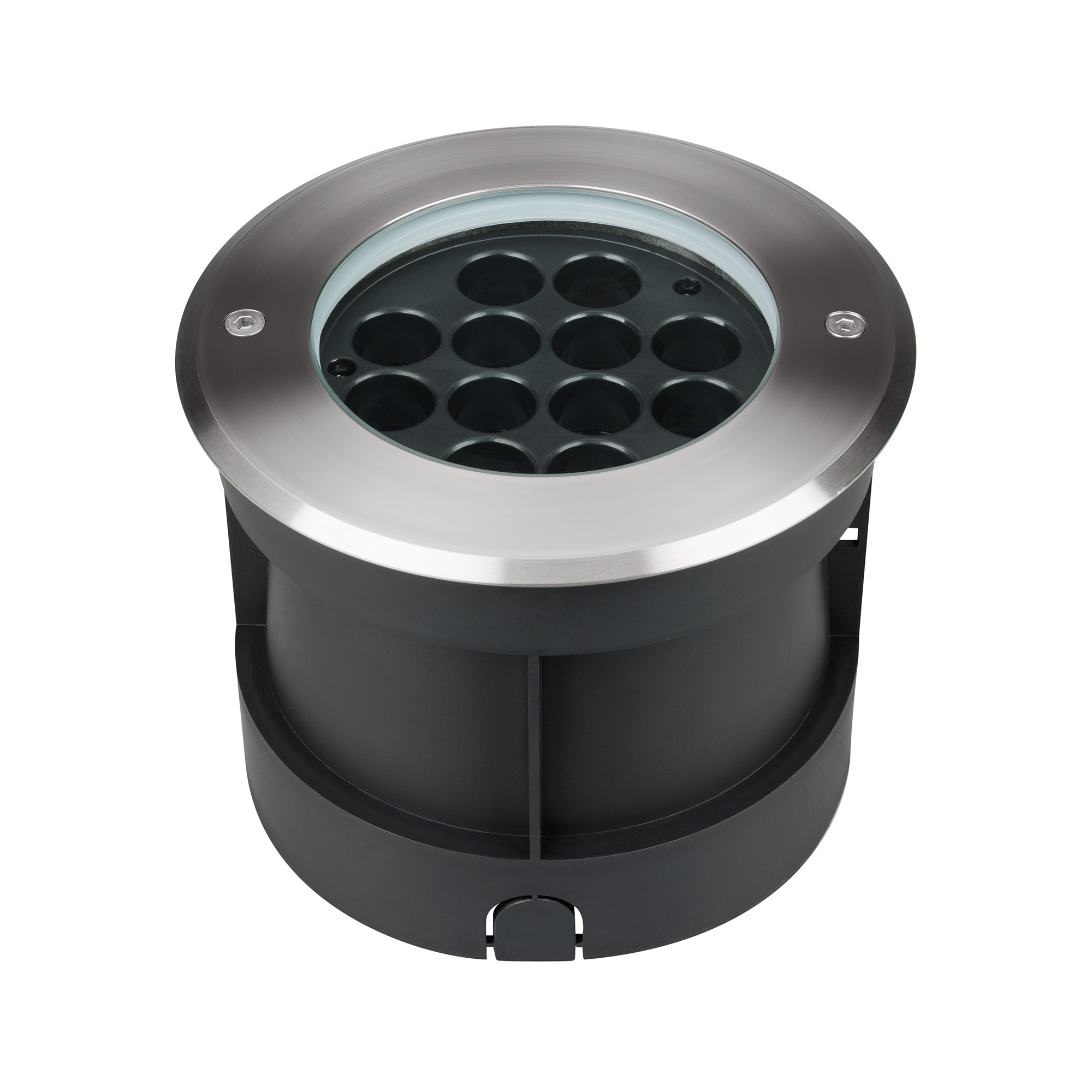 Встраиваемый светодиодный светильник для грунта и пола. Мощность 25 Вт, световой поток 2217 лм, цвет дневной 4000К. CRI(Ra)>80, угол 10°. Круглый влагозащищенный корпус IP67, нержавеющая сталь. Экран закалённое стекло. Питание 230В, 25Вт. Размер DxH Ø180x140мм. Установка в отверстие DxH Ø166x137мм.
