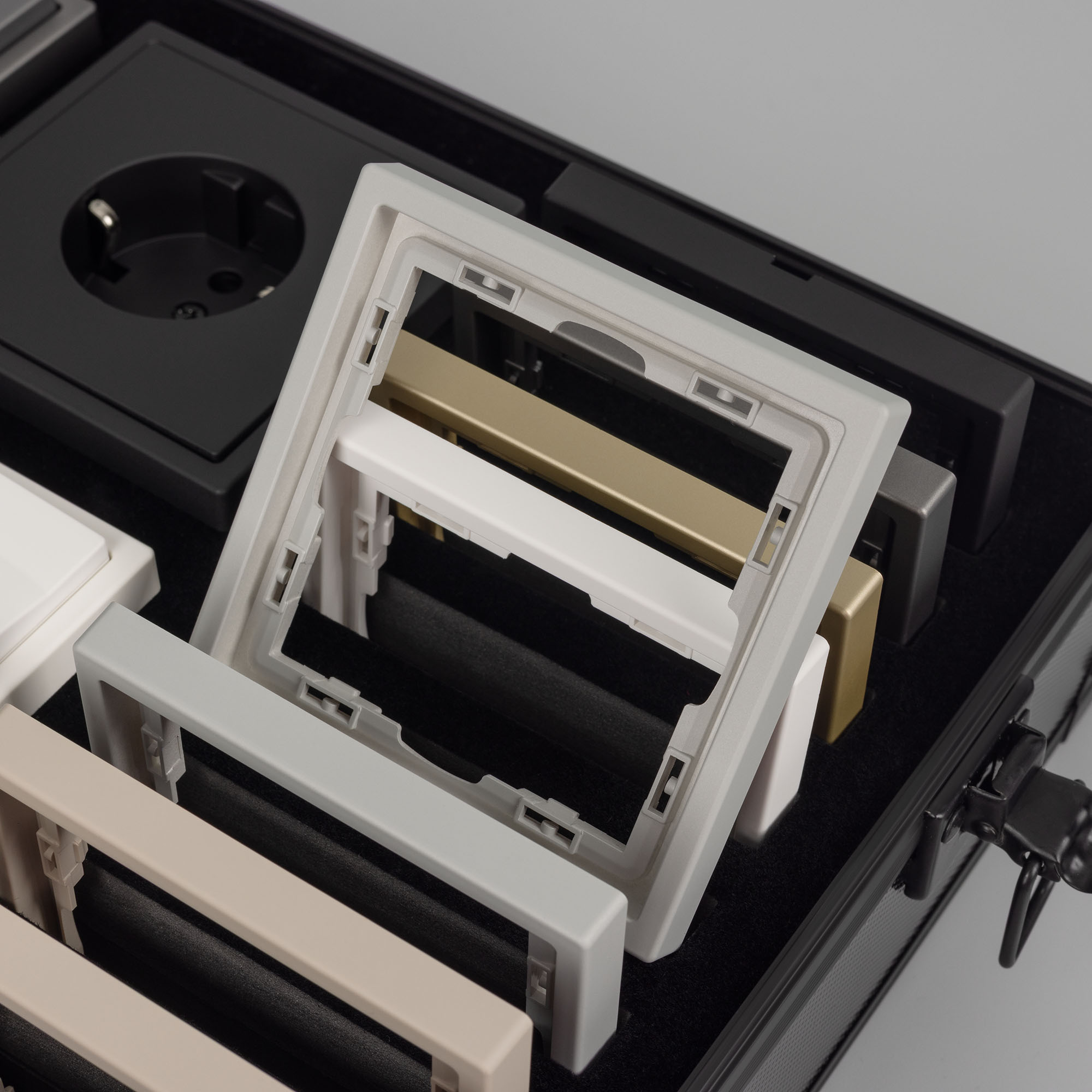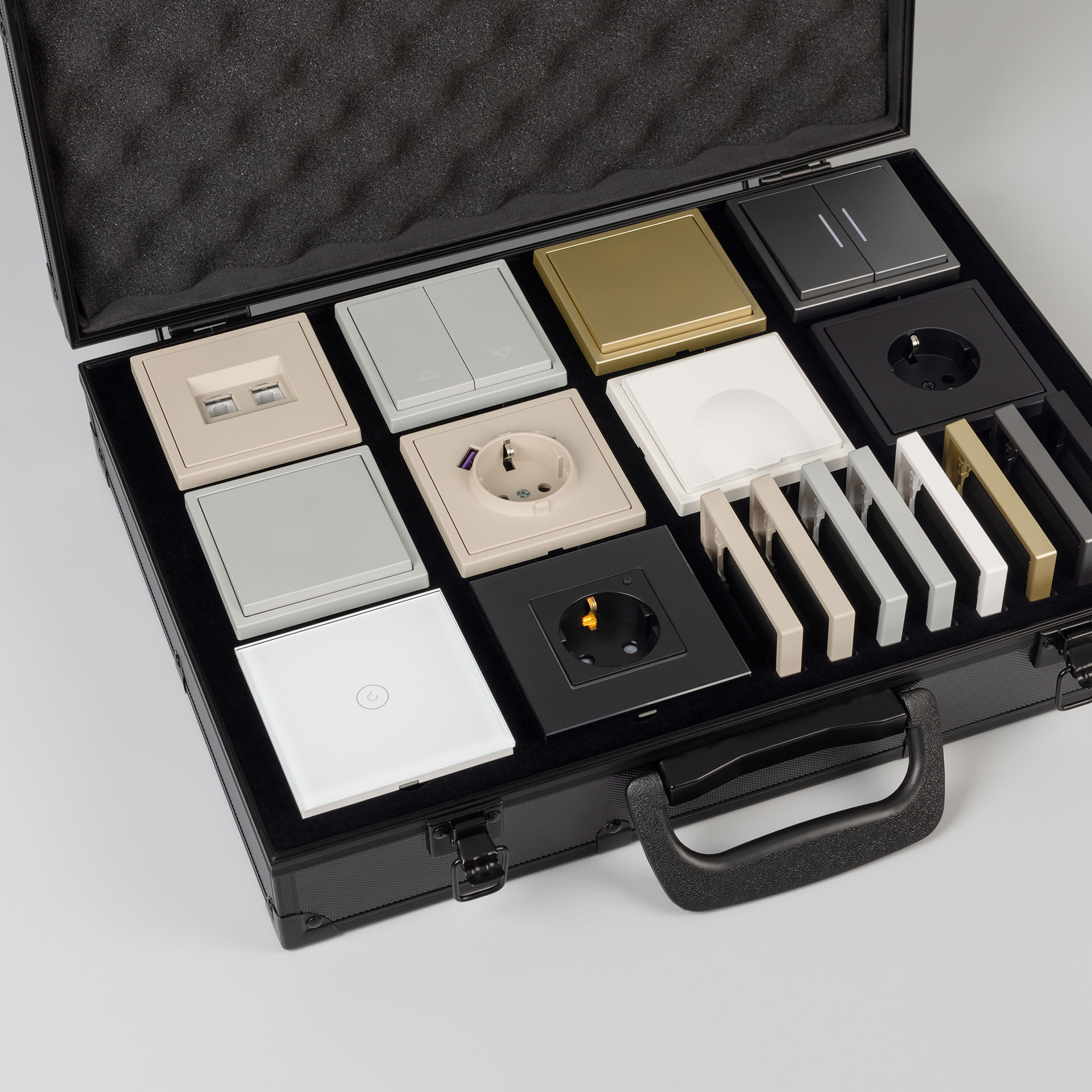 Демо-кейс с сериями NOBE и OMALI. Демо-кейс содержит: Рамки серии NOBE в цветах Белый кварц, Черный оникс, Золотой песок и Серый базальт. Поверхность рамок имеет Soft-Touch покрытие: арт.054212 - 2шт арт.054213 - 2шт арт.054214 - 2шт арт.054211 - 2шт арт.059454 - 4шт арт.059455 - 4шт Механизм розетки под евровилку в цвете Черный оникс – арт. 054277 Механизм розетки влагозащищенный в цвете Белый кварц – арт. 054280 Механизм сдвоенной розетки под выходы RJ45 для интернет кабеля в цвете Кашемир - арт.059450 Механизм розетки под евровилку с доп. Выходами USB Type A+C в цвете Кашемир – арт. 059444 Механизм выключателя на две клавиши с подсветкой LED (непроходной) в цвете Серый базальт - арт.054266. Механизм выключателя на одну клавишу (непроходной) в цвете Золотой песок - арт.054244 Механизм выключателя на одну клавишу звонкового типа в цвете Никель - арт.059437 Механизм выключателя для управления шторами и жалюзи в цвете Никель – арт. 059435 Выключатель сенсорный на одну клавишу с Zigbee управлением в белом цвете - арт.050035 Розетка с Zigbee управлением в черном цвете - арт. 050216 Рамки представленной серии накладного типа монтажа - не требуют дополнительного оборудования для установки рамки на механизме.