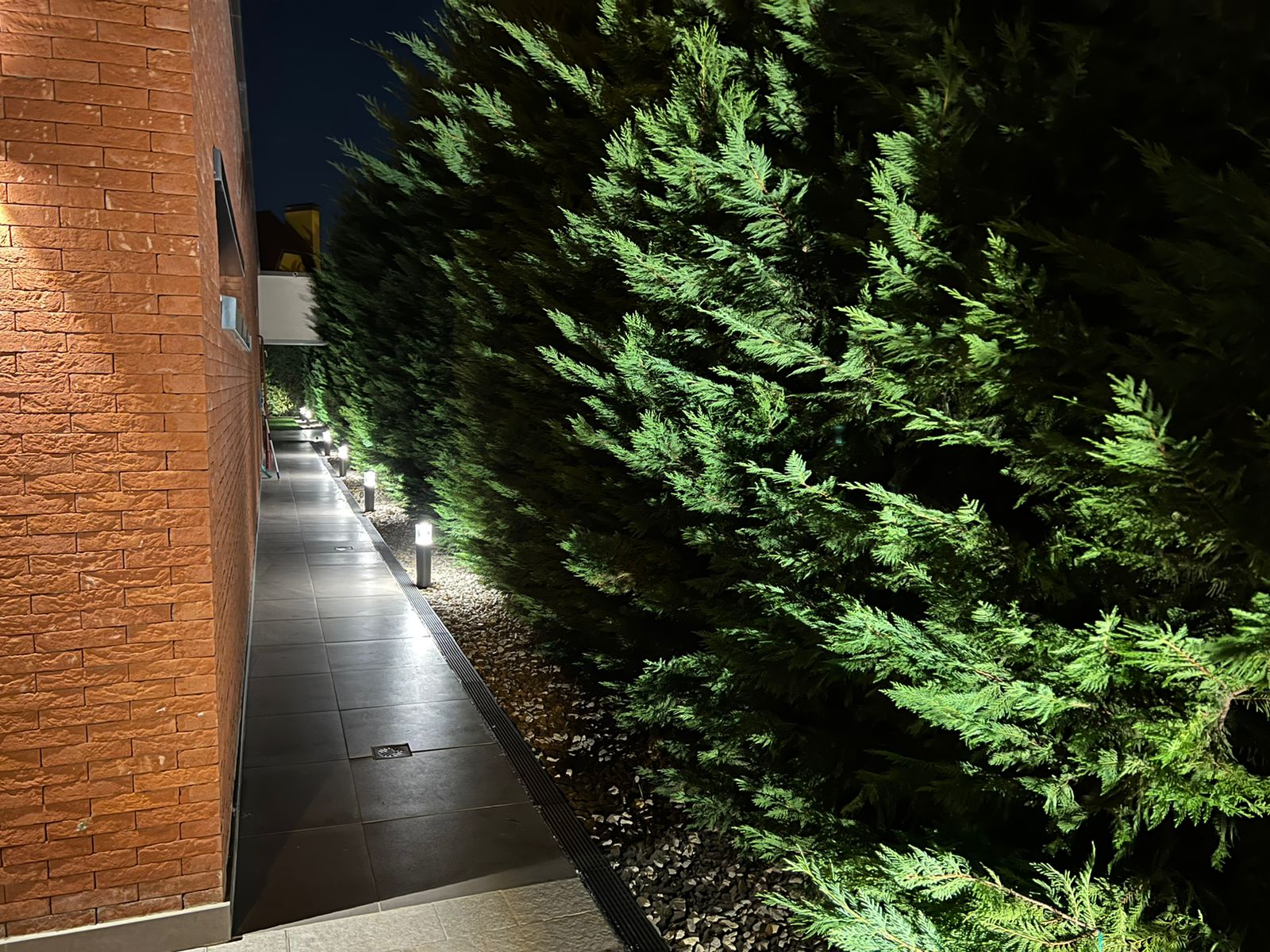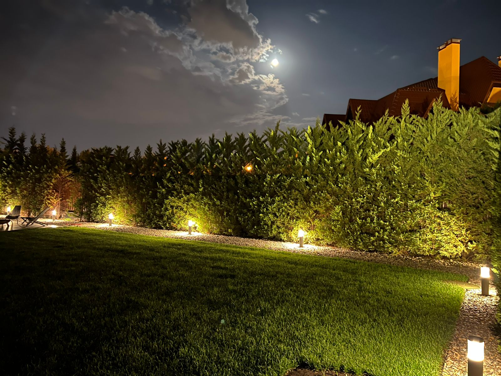 Для ландшафтного освещения выбор был сделан в пользу светильника LGD-STEM-BOLL-H500-10W. Светильники-столбики расставлены по периметру территории, что обеспечивает безопасность и уверенность в отсутствии посторонних на участке.