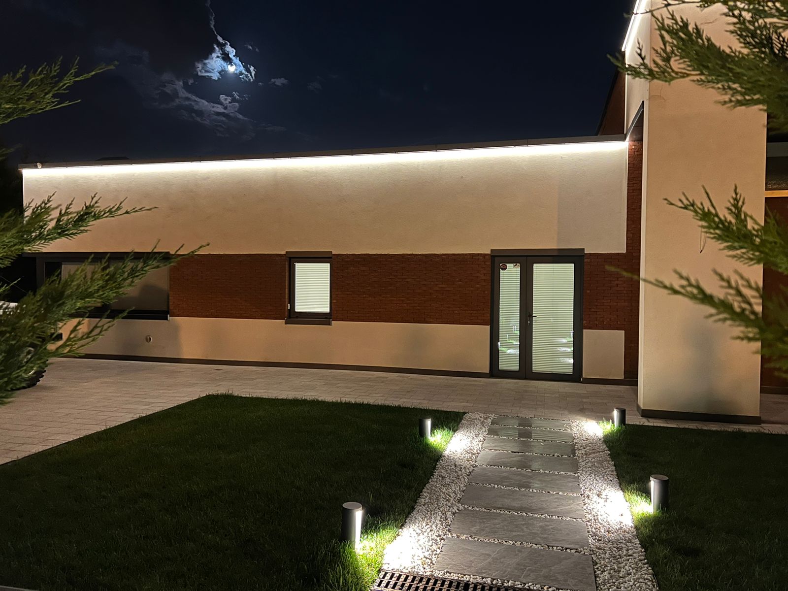 Сверху по периметру побеленных стен дома проходит подсветка, выполненная с помощью герметичной светодиодной ленты. Теплое белое свечение ленты отражается от светлой поверхности фасада, за счет чего здание выглядит воздушно на фоне ночного пейзажа. Кроме того, контурная подсветка подчеркивает геометрию строения.