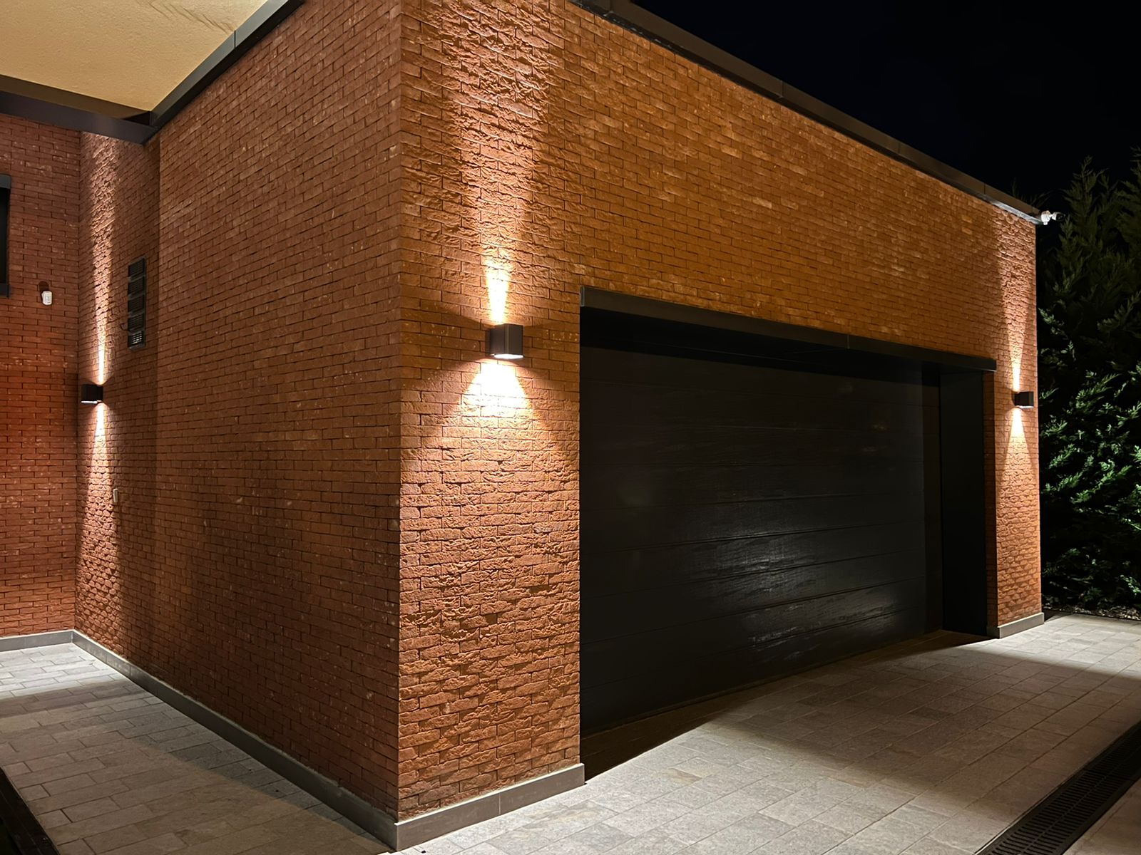 Кирпичный фасад дома подсвечивается настенными светильниками LGD-Wall-Vario-J2G-12W с двусторонним свечением вверх-вниз. Благодаря изменяемому углу излучения был сформирован световой рисунок с учетом особенностей фасада.
