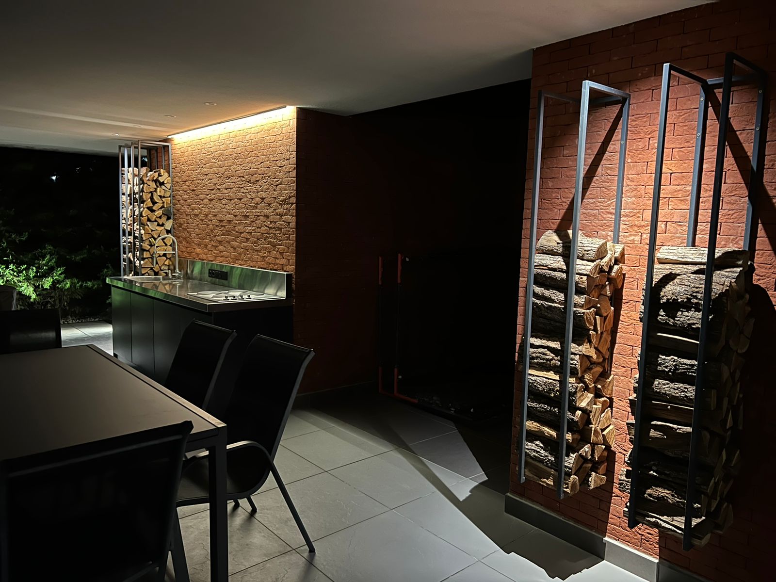 Одной из прелестей частного дома является возможность наслаждаться приготовлением и приемом пищи на улице. Поэтому в данном проекте освещению террасы с уличной кухней уделяется особое внимание. В минималистичном дизайне террасы преобладают простые материалы: кирпич, металл, дерево. Источники света с ярко выраженной наружностью стали бы привлекать к себе слишком много внимания, поэтому выбор был сделан в пользу «безликих» даунлайтов и световой линии.
