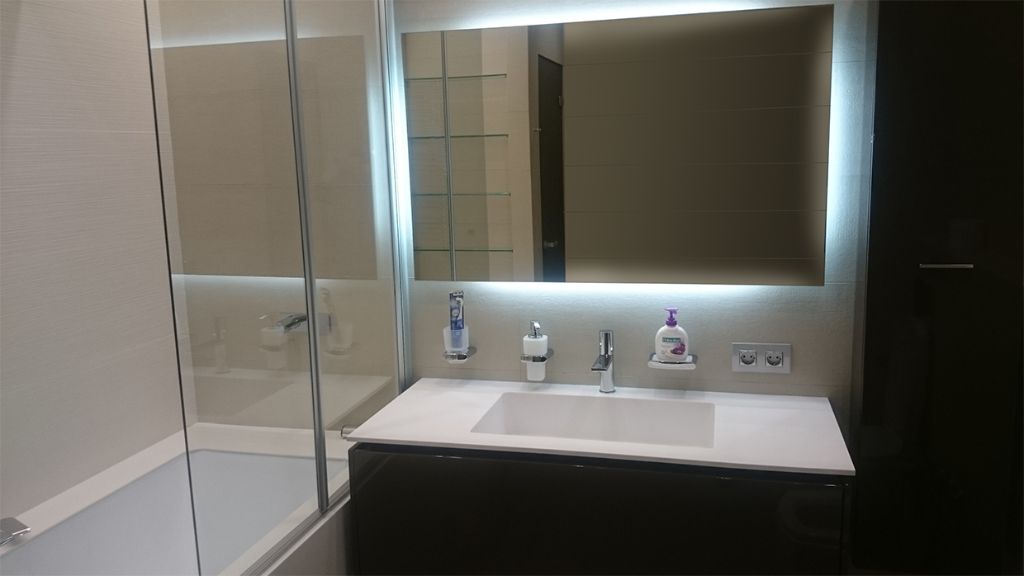 К функциональной подсветке можно также отнести подсветку зеркал в ванной и душевой. С обратной стороны зеркал была смонтирована светодиодная лента Arlight чистого белого цвета свечения. Свет при этом не бьет в глаза, но в то же время делает нанесение макияжа или бритьё куда более комфортным, и не искажает цвета.