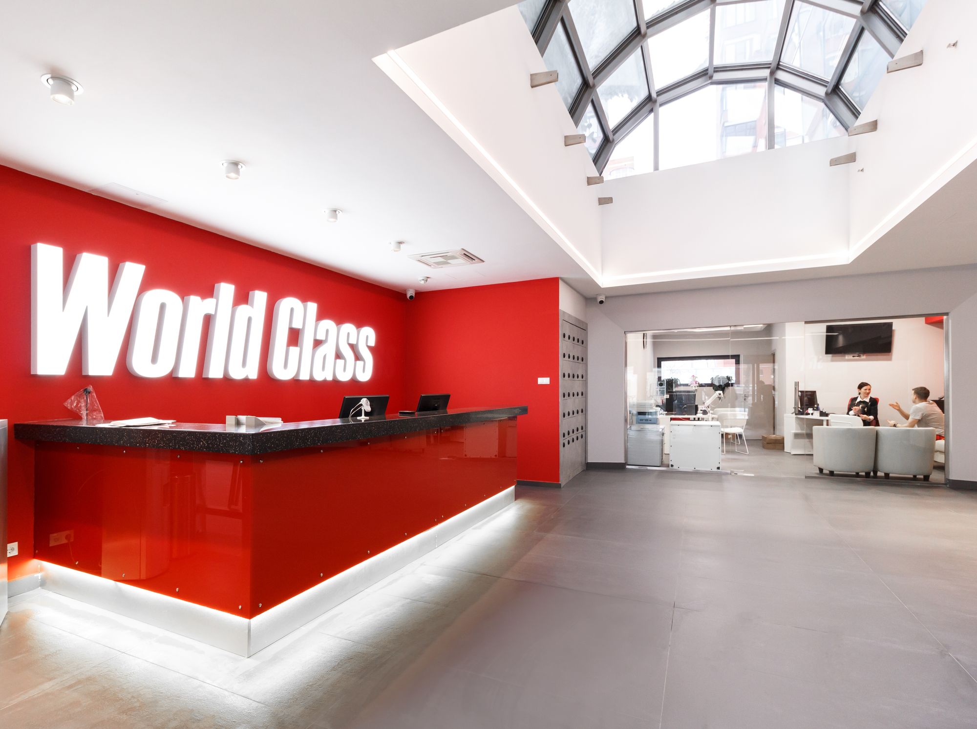 Основное освещение тренажерного зала выполнено с использованием круглых световых конструкций под потолком. Потолочные светильники выглядят как уточненные дизайнерские объекты. В зоне ресепшен размещен большой потолочный светильник, напоминающий мансардное окно, сквозь которое в помещение проникает солнечный свет. Двухрядные ленты с увеличенным числом светодиодов позволяют сделать подсветку равномерной, без видимых точек светодиодов.