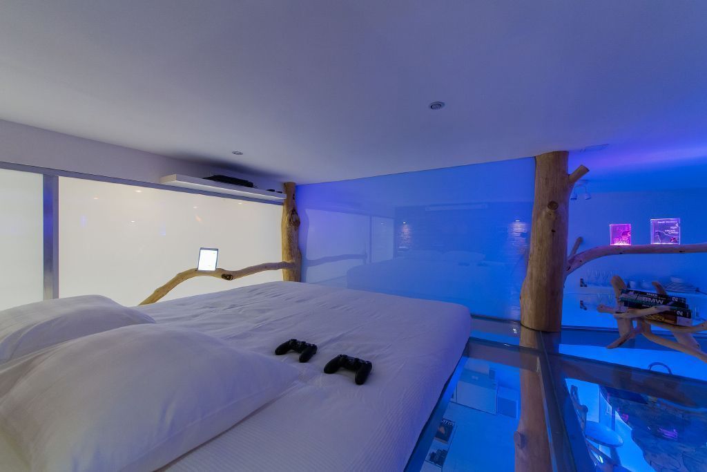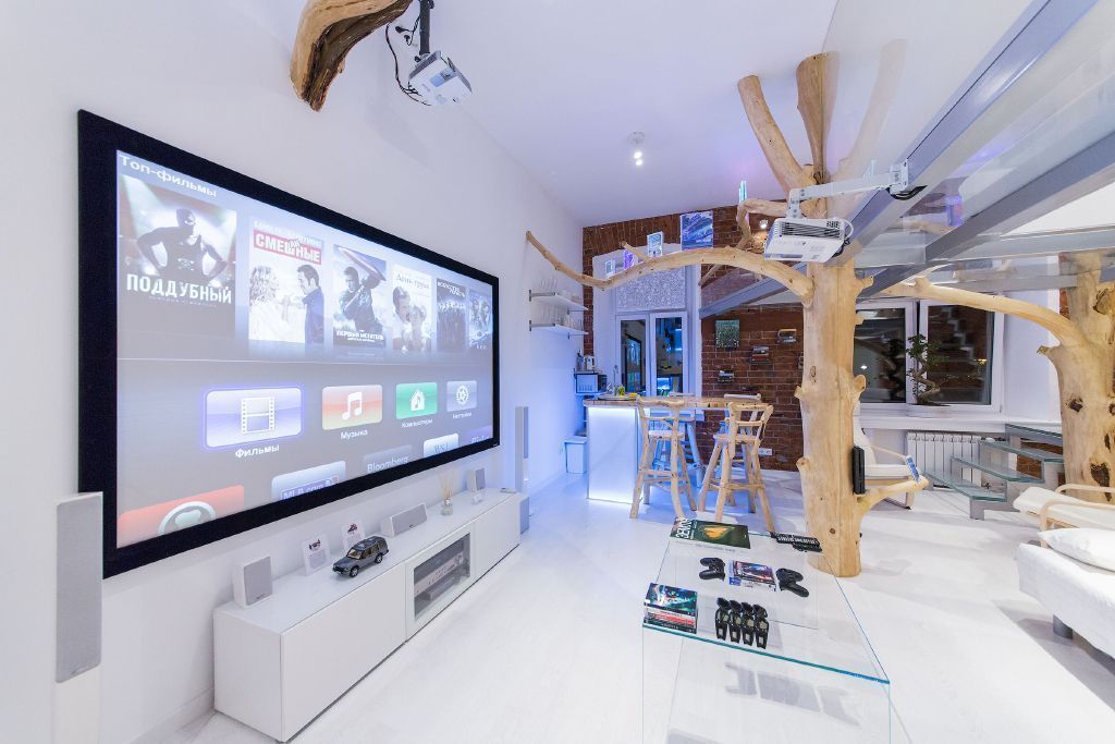 Второй уровень квартиры-студии был выделен для спальной зоны, её отделили от основного пространства необычным стеклом, способным изменять степень прозрачности. Оно было оснащено дополнительной светодиодной подсветкой на основе многоцветной светодиодной ленты arlight®. Мультицветная RGB светодиодная лента arlight® также используется в подсветке основания стола-стойки обеденный зоны студии.