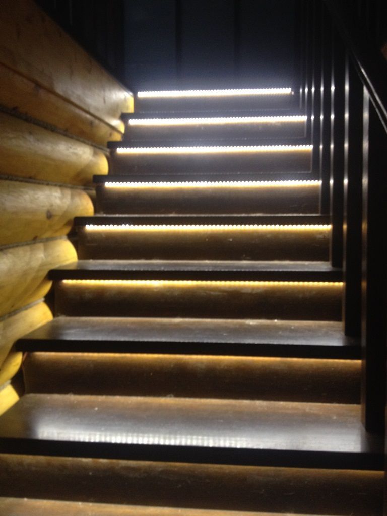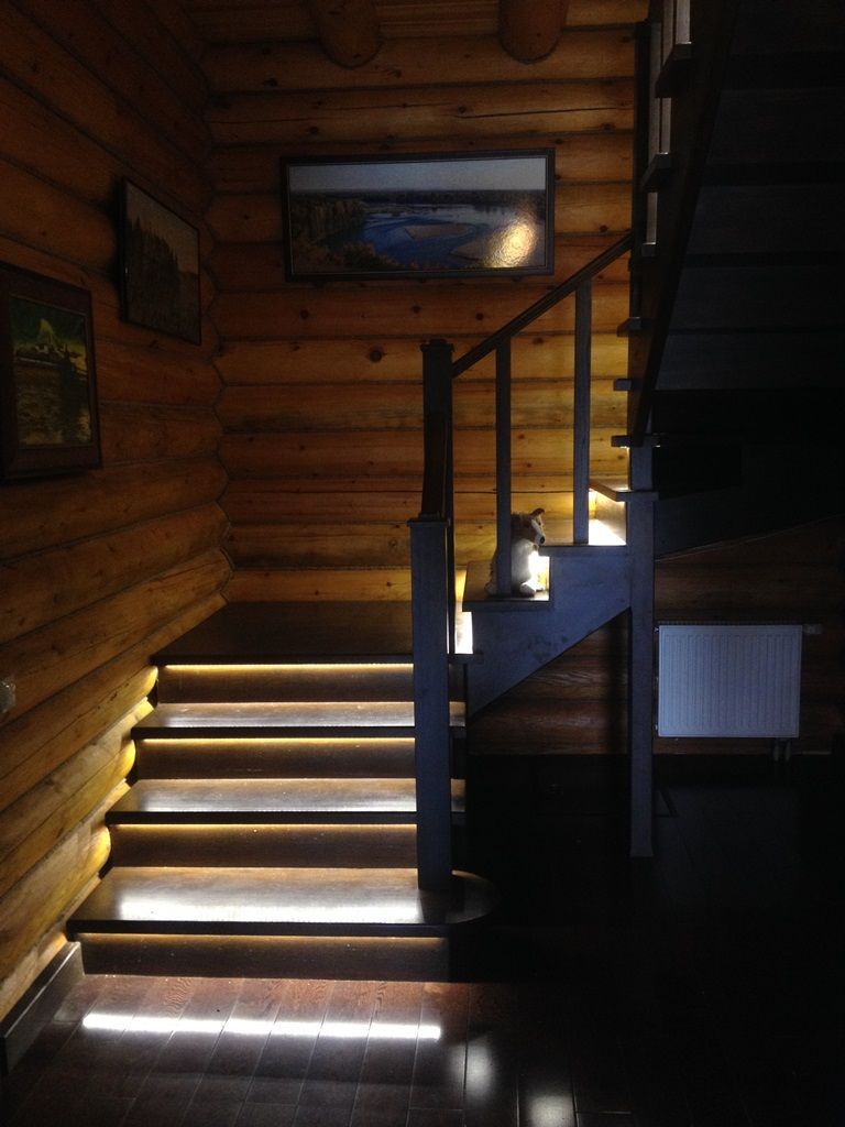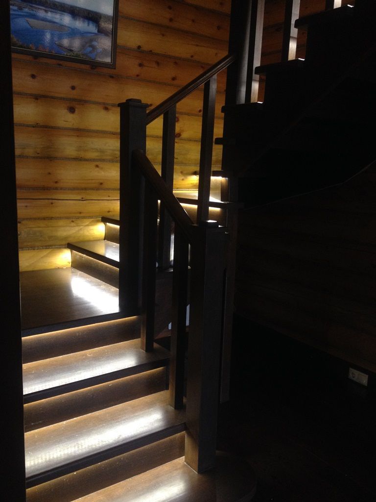 Светодиодная подсветка лестниц, выполняет сразу две функции - с одной стороны является декоративным элементом интерьера, с другой стороны обеспечивает безопасность передвижения в темное время. Вариантов расположения подсветки очень много. Это размещение на поверхности ступени светодиодной ленты в специальном алюминиевом профиле, расположение светодиодной ленты под ступенями, монтаж вдоль всей лестницы в стены или на перила. Для удобства и экономии электроэнергии можно также применить различные датчики управления освещением - микроволновые, инфракрасные и фотореле. В данном проекте подсветка лестниц выполнена с применением светодиодного оборудования торговой марки arlight®.