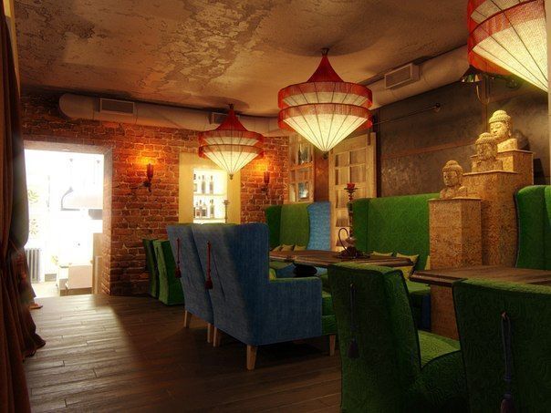 В данном ресторане была установлена декоративная и акцентная подсветка полок и других деталей интерьера.