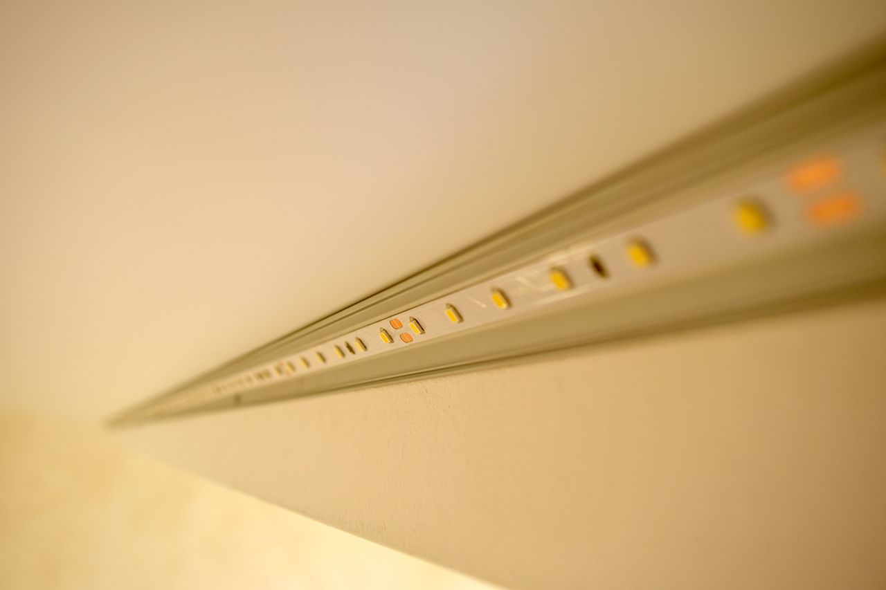 Дополнительное светодиодное освещение в многоуровневом потолке из гипсокартона. Зонирование помещения вертикальными линиями света.